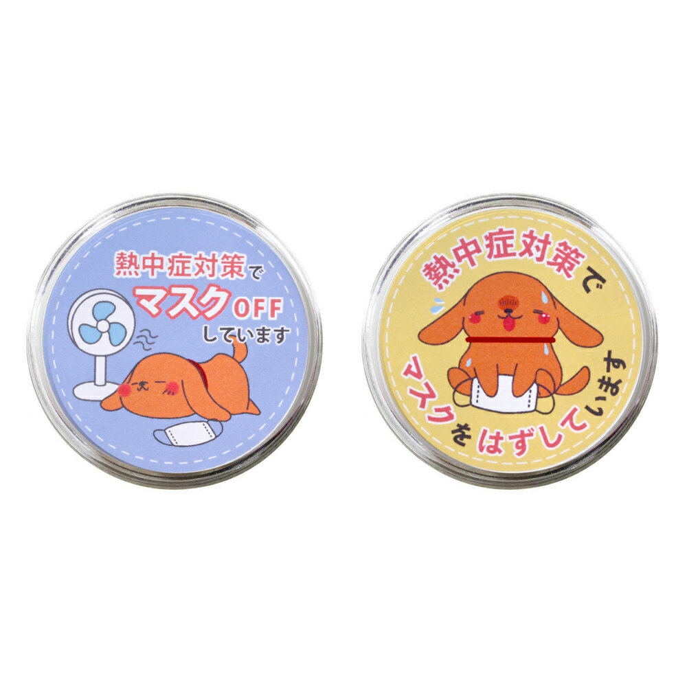 熱中症の予防としてマスクを外す時に使えるサイン用のクリップバッジ。 夏の日や、運動をする時など、 熱中症の予防にマスクを外したい・・・そんな時に しっかりと熱中症対策であること周りの方にアピールできるバッジです。 遠目からでも分かりやすい直径6cmの大きめサイズ。 マスクを外した犬(大王製作所オリジナルキャラクター犬:さとちゃん)の デザインで対策していることをアピール。 裏面にクリップがついているので穴を開けたくない衣類にもお使いいただけます。 材質 本体:ポリスチレン、フタ:アクリル、ピン:鉄 サイズ 直径φ6cm 重量 1個あたり約10g カラー ブルー|イエロー|2種セット 入数 1個 ネコポス便 対応可