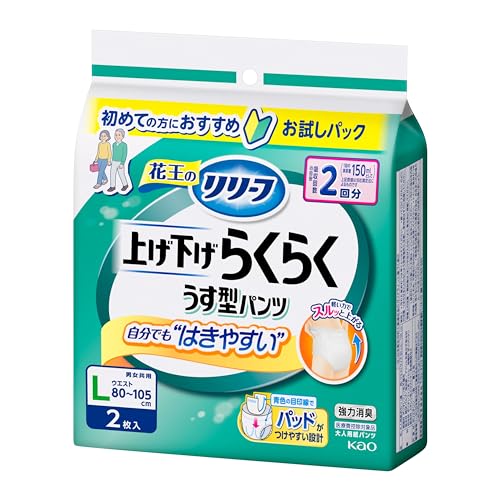 パンツ式ホワイト/L~LL2枚/-・Size:L~LL2枚・パッケージ個数:1・はじめての方に!お試しパック商品紹介 花王リリーフまるで下着の3つのこだわり♪ 1.超うす型で綿下着のようなはき心地!ゴワゴワしない、やわらかな肌ざわり♪ 2.後ろ姿すっきり!しなやかフィットで、お尻まわりも、もたつかない♪ 3.お出かけにも安心!すばやく吸収&消臭。安心の2回分吸収♪ ムレにくい全面通気性。 抗菌消臭技術によって、臭いの発生から強力ブロック。 時々トイレに間に合わない方に 男女共用 L-LLサイズ(ウエスト85~115cm) 吸収回数の目安:2回分(1回の排尿量150ml*として) カラー:ホワイト *数値は当社測定法によるものです (医療費控除対象品) 使用上の注意 ・開封後は、ほこりや虫が入らないよう、衛生的に保管してください。 使用方法 ≪使い方≫ 足ぐりが大きく開いている方を前にして、はいてください。 ウエストまで紙パンツをしっかり引き上げてください。 取り替える時は下着のようにお脱ぎください。 ● 快適なはき心地のために、「まるで下着1枚」でのご使用をおすすめします。 安全警告 ご使用上の注意 ご使用前に必ずお読みください 1. 本品は紙おむつですので、洗濯しないでください。 2. 誤って洗濯した場合は、脱水後、衣類についたパルプやゼリー状の粒*をはたき落とし、洗濯機内部に残ったものは取り除いてください。 *ゼリー状の粒は高分子吸水材が水分を吸収したものです。 3. 変形することがありますので、暖房器具の近くなど高温になる所に置かないでください。 4. 肌に残った大便はかぶれの原因になりますのできれいにふき取ってください。かぶれたり、紙おむつがお肌に合わない場合には、ご使用を中止し、医師にご相談ください。 5. ご使用者が誤って口にすることがないよう保管に注意し、使用後はすぐに処理してください。食べてしまった場合は、早急に医師にご相談ください。 6. 本品は転倒しないことを保証するものではありません。 7. 衛生品ですので、1日に1回は交換をおすすめします。 使用上の注意 ・汚れた紙おむつは早くとりかえてください。 ・誤って口に入れたり、のどにつまらせることのないよう保管場所に注意し、使用後はすぐに処理してください。 保管上の注意 ・開封後は、ほこりや虫が入らないよう、衛生的に保管してください。