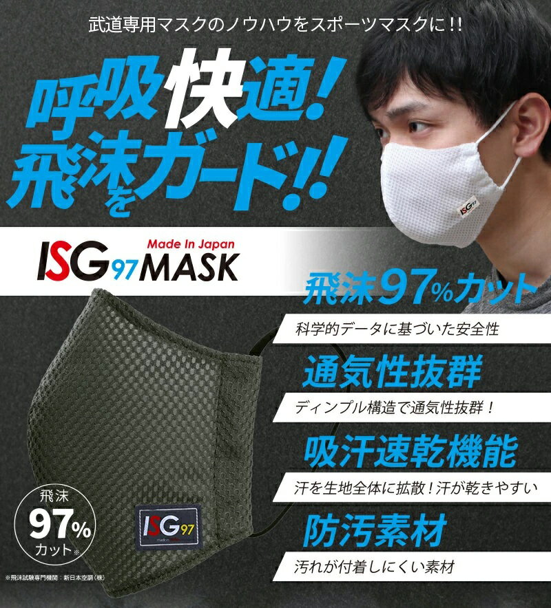 冷感COOLMASK ISG97冷感マスク 通気性と安全性に更に快適さを追求した最新モデル ・飛まつ97%カット 科学的データに基づいた安全性 ・冷感抗菌素材 涼感に優れ、抗菌作用で清潔を保つ! ・通気性抜群 ディンブル構造で通気性抜群! ・吸汗速乾機能 汗を生地全体に拡散!汗が乾きやすい 大好評のISG97マスクに、蒸し暑い夏の稽古に対応した 通気性、快適さをさらに追及した最新モデルが誕生! 接触冷感素材で暑い日でも快適 マスクを着けたときの厚さを軽減するため、内側に接触冷感素材を使用しました。 放熱性に優れ、蒸し暑い夏でもひんやりと感じる効果があります。 ------- ポイント1 飛まつを97%カットしながらも呼吸しやすい ------- 剣道・空手などの武道で安心・安全にお使い頂けるように科学的に裏づけされた飛まつ97%カット。 (飛まつ試験専門機関:新日本空調(株)調べ) また、普段の生活でも、息苦しくなりやすいマスク。肺活量や持久力を高めるためのトレーニングでマスクを使うと、されに息苦しくなってしまいます。 「ISG97」は飛まつを97%カットしながらも、通気性を確保し「息がしやすい」ディンプル構造素材で作製されています。 ------- ポイント2 接触冷感・抗菌素材を使用 ------- 肌の接触面に接触冷感素材を使用。熱中症対策や暑さ対策として効果的です。 さらに抗菌効果も追加して、夏場や運動中の高温多湿の環境においても清潔を保ちます。 ------- ポイント3 洗える、吸汗速乾機能、防汚性素材 ------- 運動中は汗をかくので、簡単に洗えてお手入れできることも大事。スポーツマスクは洗ってもすぐに乾く速乾素材が必須です。 「ISG97」は汗が乾きやすい吸汗速乾性でありながら、かつ汚れが付着しにくい防汚性素材のマスクです。 ------- 仕様 ------- 色:5色 Bkack黒 White白 Grayグレー Silverシルバー Japanblue紺 サイズ:5サイズ SS/S/M/L/LL(=XL) ------- 「ISG」の意味: 「IDEAL SAFETY GURAD」アイデアル セーフティ ガード 理想的な安全ガード -------冷感COOLMASK ISG97冷感マスク 大好評のISG97マスクに、蒸し暑い夏の稽古に対応した通気性、快適さをさらに追及した最新モデルが誕生! 通気性と安全性に更に快適さを追求した最新モデル
