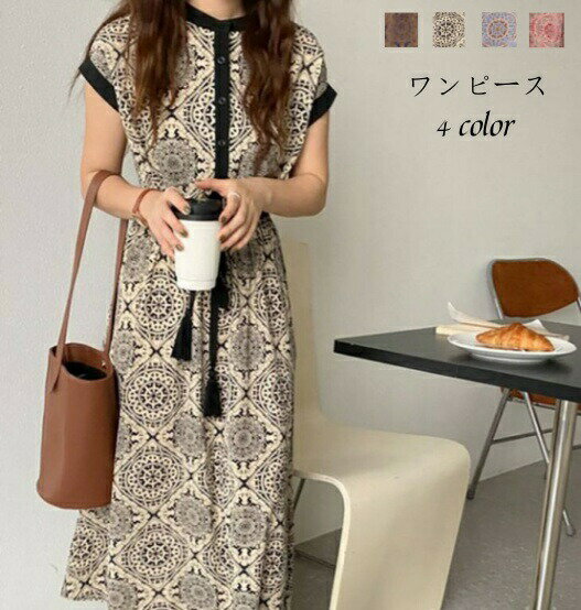 ★ポイント10倍★ワンピース フレンチスリーブ ダマスク柄 レディース ロング丈 マキシ丈 タッセル 半袖 ペイズリー柄 フレア ハイウエスト エスニック きれいめ 大人 上品 春 送料無料