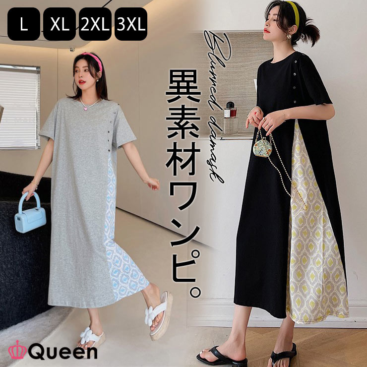 大きいサイズの服 ぼかしダマスクの異素材ななめスリットワンピ大きいサイズ レディース 切り替えワンピース Tシャツワンピ エスニック柄 ストレート ロング丈 夏 L LL 3L 4L ブラック グレー 新入荷 メール便可