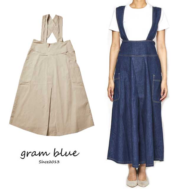 gram blue/グラムブルー/サロペット/オーバーオール/ジャンスカ/軽量/パンツ/ブルー/ネイビー/ベージュ/オールシーズン/シンプル/デニム/ボトムス/おしゃれ/ワイド/セール【SALE30%OFF】【送料無料!】gram blue【グラムブルー】フロントタックジャンパースカート【レディース】【サイズ】S・M