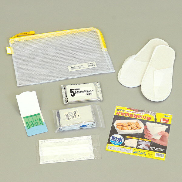 施設備蓄に!帰宅困難時を想定した防災セット!災害時、帰宅が困難になった人々を支えるために設計されたセットです。マスク・ばんそうこう・ウェットティッシュで衛生面の不安にも対応。不織布スリッパやストーンペーパーの非常用食器折り紙など、現場で「本当に必要なもの」が揃った実用性の高いセットです。5年保証付きアイテムも含まれており、長期備蓄にも安心。コンパクトに保管できるため、学校・企業・施設備蓄にぴったりです。【内容】・連絡袋:名前が書ける連絡袋。・ばんそうこう:2枚入り。・非常用食器折り紙:水に強いストーンペーパーを使用しています。コップや皿の折り方付きで、災害時に役立ちます。水洗い可能なので、繰り返し使えます。緊急時のメモにも!・不織布マスク:ノーズワイヤー入りの不織布マスクです。衛生的な個包装。・非常用アルミ防寒寝袋:アルミ素材で保温に優れた防寒寝袋です。たためばコンパクトに。銀色でキラキラ光り目立つので、救出時の発見に役立ちます。・不織布スリッパ:前閉じで履きやすい使い捨てスリッパです。・5年保証・超防災用ウェットティッシュ20枚入:業界最長、「5年保証」の防災用のウェットティッシュです。【詳細】セット内容:連絡袋×1、ばんそうこう(2枚)×1、非常用食器折り紙×1、不織布マスク×1、非常用アルミ防寒寝袋×1、不織布スリッパ×1組、防災用ウェットティッシュ×1商品サイズ:連絡袋:約350×250×20mm、ばんそうこう:約12×53mm、非常用食器折り紙:195×195mm(1枚あたり)、不織布マスク:約175×95mm、非常用アルミ防寒寝袋:約1000×2000mm、不織布スリッパ:約280×110mm、5年保証・超防災用ウェットティッシュ20枚入:150×200mm(1枚あたり)材質:連絡袋:PVC、ばんそうこう:PVC、非常用食器折り紙:炭酸カルシウム(石灰石由来)・高密度ポリエチレン、不織布マスク:不織布、非常用アルミ防寒寝袋:アルミ蒸着PET、不織布スリッパ:不織布、5年保証・超防災用ウェットティッシュ20枚入:不織布・水・エタノール・グリセリン・メンソールエッセンス・メンソール・PEG-60水添ヒマシ油・塩化ベンザルコニウム・コロルヘキシングルコン酸塩セット内容に一部変更が生じる場合がございます。[ 防犯・防災商品 ]