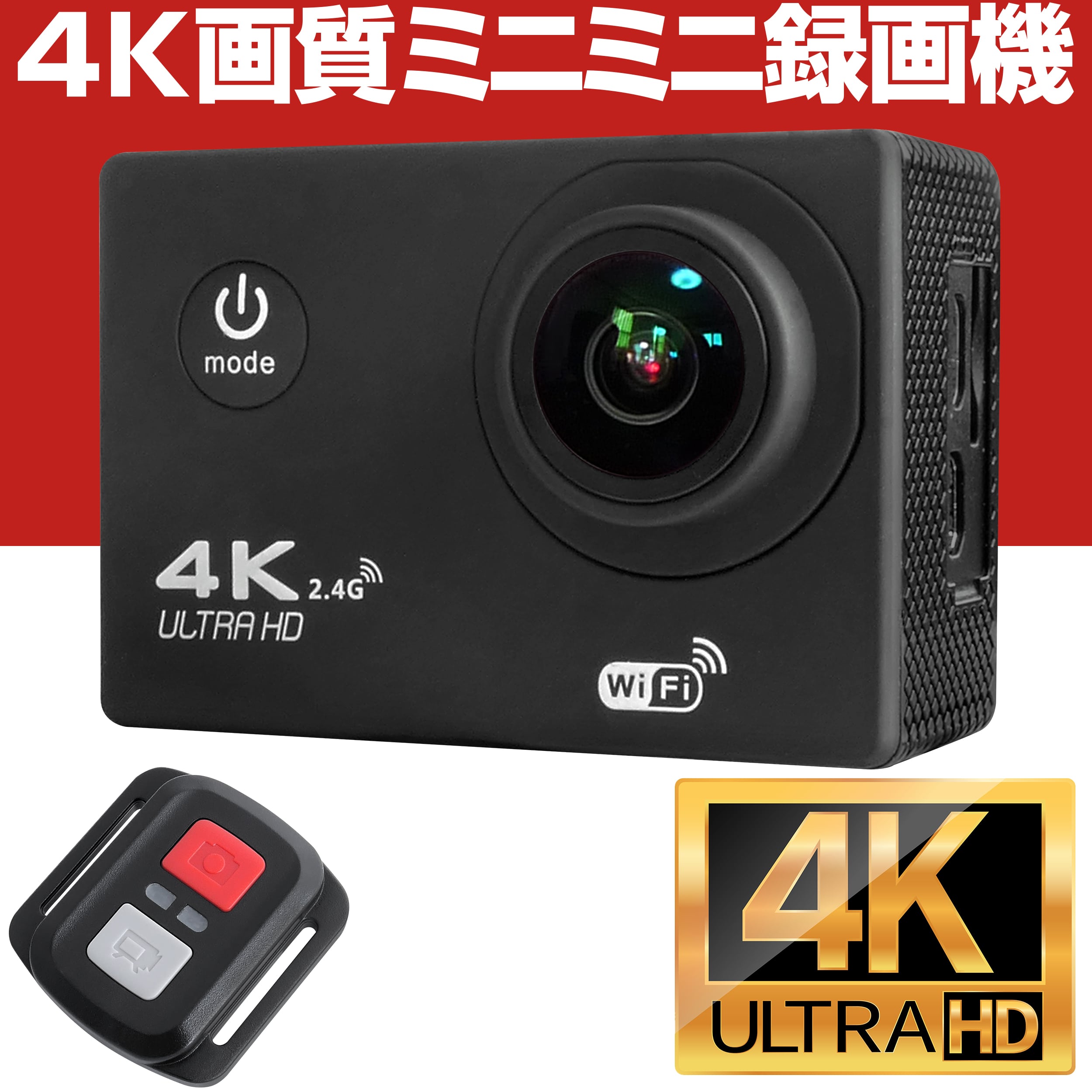 128GBカード対応、最大8時間連続録画 フルタイムで、SDカードに録画/録音 驚異の4K画質/830万画素 防犯カメラ(ミニ録画機)/ドライブレコーダー ●録画解像度は4K/800万画素 フルハイビジョンの4倍精細、スーパーハイビジョン4K解像度/830万画素(3840×2160pixel)の超高精細の映像を記録し、再生時に臨場感あふれる映像を大画面モニターでも堪能できます。 ●マニュアル録画、フルタイム録画 ボタンひとつの簡単操作で録画スタート、録画停止。任意のマニュアル録画とフルタイム録画をご利用頂けます。 ●動体検知録画 動きがあれば自動的に録画を開始、動きが無くなれば録画を停止します。窓ガラス越しの屋内にカメラを設置して、屋外にある動体を検知して録画を開始します。 ●上書き録画もタイムスタンプも 上書き録画をONにしておけばSDカードの容量がいっぱいになっても、上書きして録画し続けます。タイムスタンプをONにすれば、録画映像や静止画に撮影日時の年月日時分秒を記録することが可能です。 ●リモコンで録画も写真撮影も 専用リモコンで、写真撮影や動画撮影の操作が可能です。リモコンの送信距離は約3m以内です。 ●マイクロSDカードへ記録 最大128GBのマイクロSDカードに対応。撮影した動画や静止画はすべてマイクロSDカードに記録されます。 ●最大8時間連続録画 1080P解像度の録画でも、128GBのマイクロSDカードを使えば、最大8時間の映像を連続することができます。 ●音声も録音します 映像と同時に、音声を常時記録します。映像の再生時には映像と同時に音声もご確認いただけます。 ●静止画解像度は1600万画素 他の追随を許さない1600万画素まで引き上げました。再生時に静止画を引き延ばした画質精度の差は歴然です。 ●連続稼働時間、最大80分 本体に1050mAhのリチウムバッテリーを内蔵、充電してご利用いただけます。安定した貯蓄電力で連続50~80分の連続稼働を実現しました。 ※別途販売で電源アダプターをご用意しました。常時給電しますので、バッテリーの残量を気にせずご利用いただけます。 ●人の視野角と同じ角度で撮影 人間の視野角とほぼ同じ170度の視野角を実現した超ワイドレンズを採用。圧倒的な広範囲をカバーして、人の目で捉えたような映像を撮影します。 ●夜間もカラー映像を撮影 夜間でも、道路や強い照明のある場所では鮮明な撮影が可能です。赤外線による暗視撮影ではありませんので、カラー映像で撮影します。 ●その場でプレイバック液晶画面 本体背面に2インチのTFT液晶モニターを搭載。撮影した動画や静止画をその場で確認することができます。モニターを見ながら、撮影アングルの調整が可能です。 ●外部モニターで再生できる microHDMIケーブル(別途必要)を利用すれば、録画映像をHDMI入力できる外部モニターに出力して再生することができます。 ●どこにでも設定できます 付属の吸盤ブラケットは、吸盤が吸い付くところならどこでも設置できます。角度を調整できますのでいろんな面に取り付けたり、向きを調整することも可能です。 ●室内から屋外の撮影もできる 窓に取り付ければ、室内から屋外の様子を撮影できますので、屋外用防犯カメラに近い役割を果たします。 ●ドライブレコーダーに早変わり 付属のクリップと吸盤ブラケットを使って、フロントガラスに装着するだけです。シガーソケットUSBチャージャー(別途必要)を利用すれば、常時電力を供給しながらドライブレコーダーとしてご利用できます。 ●たった42グラムの超軽量 超小型、超軽量です。ポケットに入れてどこにでも持ち運べる携帯4Kカメラです。 ●日本語マニュアル、日本語表示 本体液晶モニターのメニューは、日本語表示にして安心してご利用できます。基本的な使い方各種機能、各種設定方法など親切で詳しい日本語マニュアル付きです。 【関連キーワード】 アクションカメラ SDカード 屋内 屋外 4k マウント アタッチメント アクセサリー 防水 ウェアラブルカメラ オートバイ バイク 一体型 まいくろsdカード 完全防水 吸盤 小型 録画 SD録画 動画 夜間 撮影 防犯 監視 取り付け【選択項目の追加料金について】 選択項目の追加分の価格については、買いものカゴや楽天市場から届きます初回の自動サンクスメールに反映されません。 当店で処理後、2回目に届くサンクスメールに反映されます。 【領収書の発行について】 領収書の発行については、注文履歴の中に「領収書発行する」ボタンがございますので、そこから発行してプリントして頂けるようお願いします。 紙での領収書については、ご注文時のみお受け致します。ご注文時以後の発行は、致しませんので御了承くださいませ。 クレジットカード購入(5万円以上)による領収書発行について、弊社では収入印紙の貼り付け発行はしておりません。 代金引換でのご注文の場合は、発送伝票控えが領収書となります。 【お客様都合による交換・返品】 商品到着日から起算して1週間以内にご連絡を頂いた場合に限り、