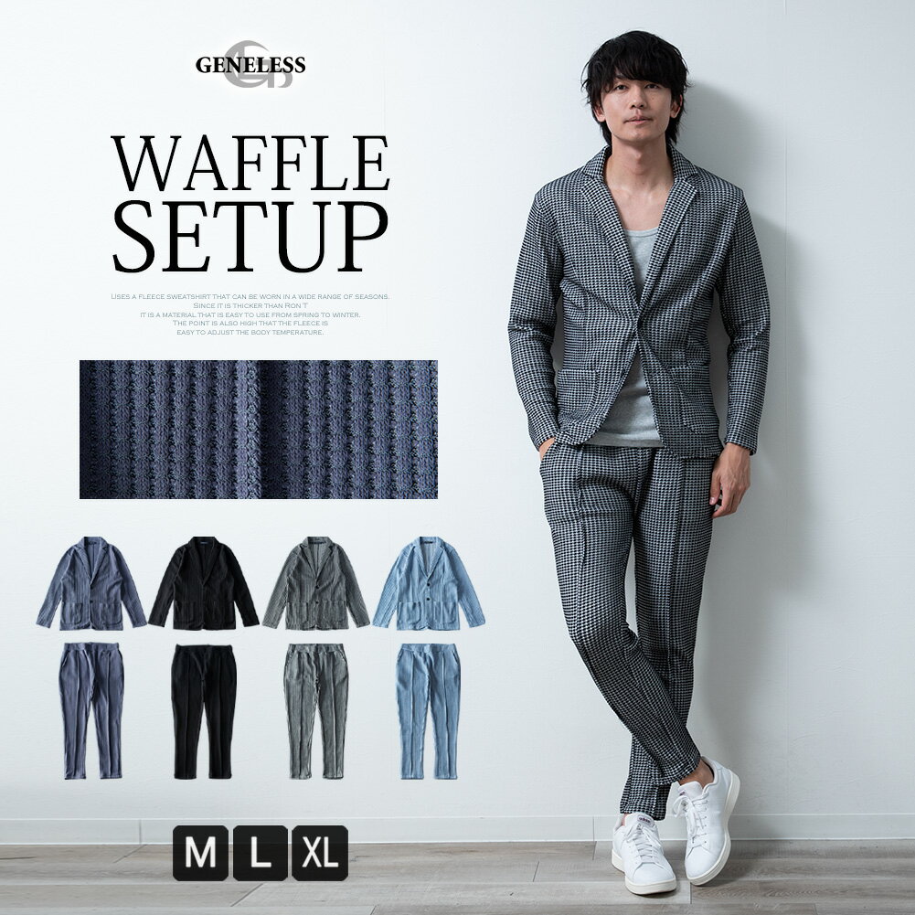 メンズ セットアップ 秋冬 テーラード ジャケット お洒落 ワッフル地 無地 シンプル ストレッチ スラックス ブラック グレー ネイビー M L LL XL 大きいサイズセットアップ メンズ テーラードジャケット 上下セット ワッフル tテーラード ジャケット パンツ スリム タイト 細身 ブルゾン 柔らかい ゴムウエスト おしゃれ シンプル カジュアル 紳士服 2点セット 全4色 JP628008 ジェネレス