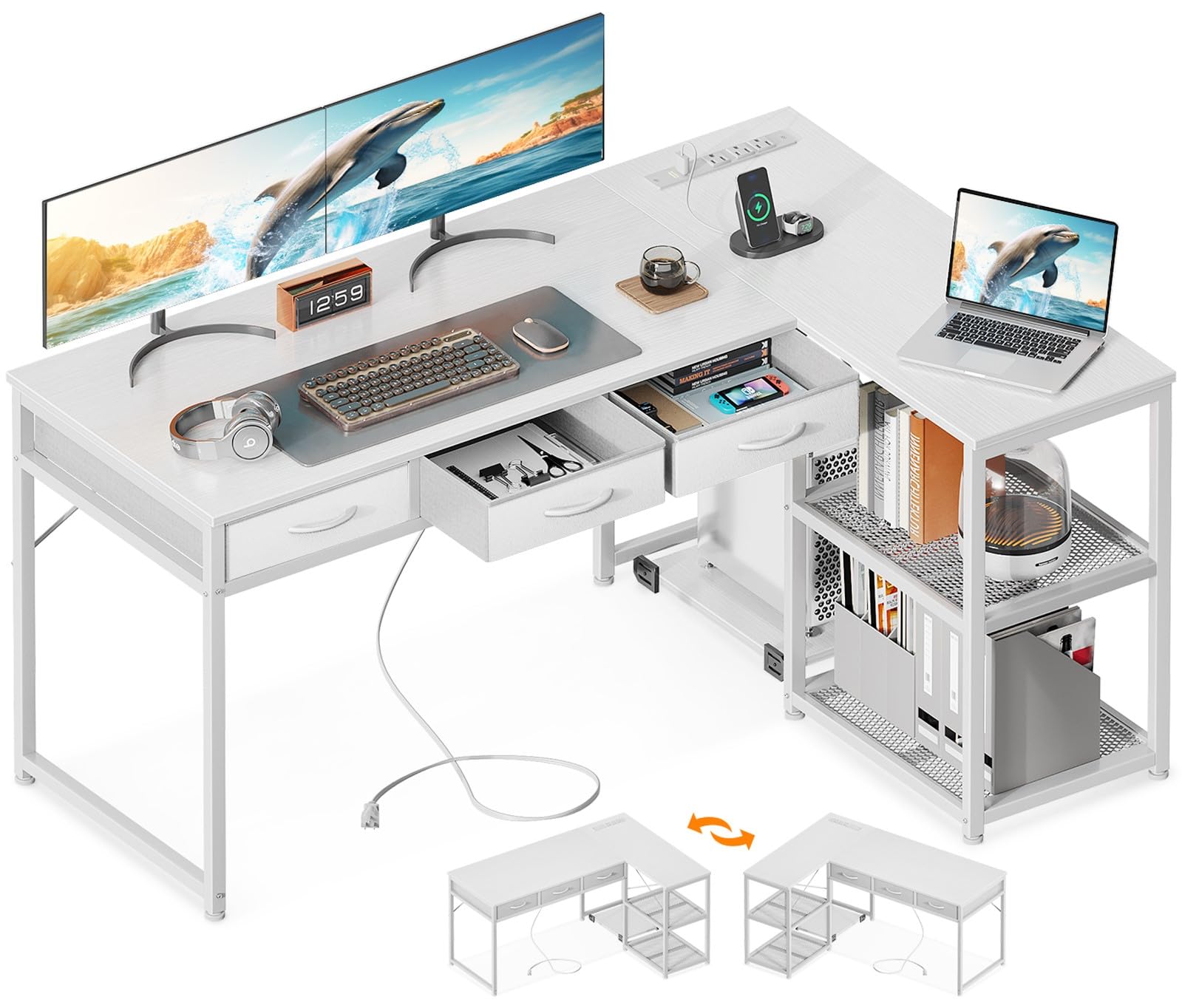 ODK ゲーミングデスク 引き出し3杯 パソコンデスク コンセント付き l字デスク デスク 机 幅135 pcデスク 棚付き 収納 desk オフィスデスク 在宅勤務 仕事用 組立簡単 ホワイト