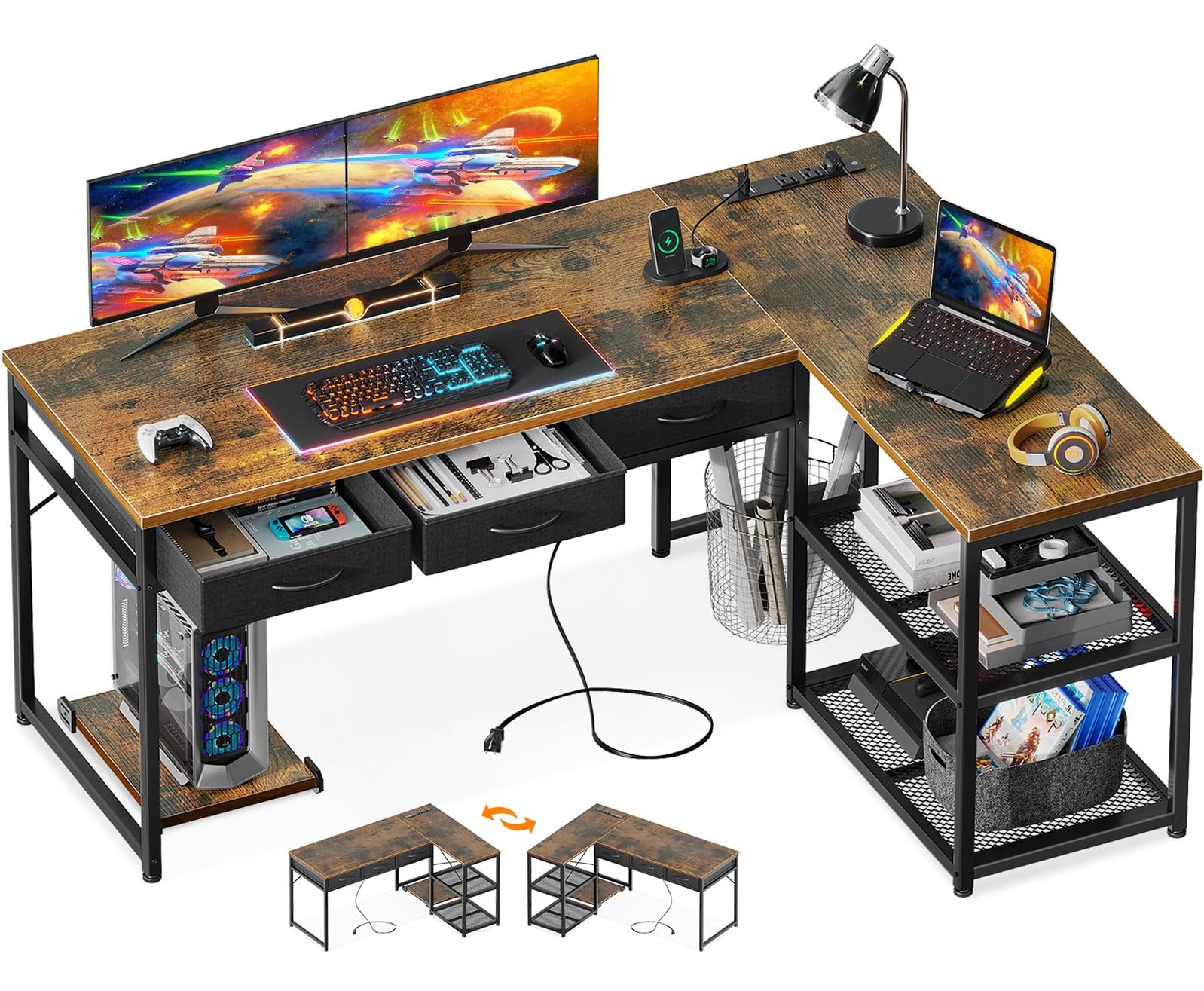・【引き出し3杯付きl字デスク・収納力満載】デスクの下には一体型の引き出しとラックが備え、本や書類などを使いたい時にサッと取り出せます。たっぷりの収納でデスク周りをスッキリ快適に!また、L字型のデザインで部屋のコーナーを最大限に活用でき、ご家庭でもオフィスでも、日常の仕事に十分なスペースを確保できます。・【コンセント付きデスク・ゲームと仕事両立】パソコンデスクとしてはもちろん、ゲーミングデスクとしても使用できるおしゃれなL字デスク。机には、2つのACコンセントとUSB ポート付きで、パソコンやスマホなどの充電ができて超便利です。また、ラックと引き出しは間取りや利き手に合わせて左右付け替え可能。・【PC置き台付きデスク・組立簡単】可動式~PC本体置き台付き、お好みによってどちらでも置きます。広々とした高品質天板で、圧迫感なく長期間のeスポーツゲームもテレワークも快適に!作業効率も格段に上がります。また、分かりやすい説明書もあり、女性にも組立簡単です。・【頑丈設計・耐久性高い】l字デスクの天板耐荷重は50kg、パソコンや周辺機器を安心に設置できます。高強度のメラミン化粧板を採用し、汚れ、キズや熱・水分に強く、長持ちしやすいpcデスクです。天板裏の補強パイプ・横揺れを防ぐクロス補強金具・脚先のアジャスター・強度と耐久性の高いスチールフレームで、ガタつきのないしっかりした使用感を実現しました。・【商品仕様】L字ゲーミングデスクはお手入れ簡単で、実用性が高く、在宅勤務、ゲームプレイ、勉強机、学習机など様々なシーンで大活躍!◆本体サイズ:幅155×奥行110×高さ78.2cm ◆本体重量:約21.4KG ◆お客様組立て品で、レンチも付属しております。◆万が一机に不具合がありましたら、いつでもお気軽にお問い合わせください。