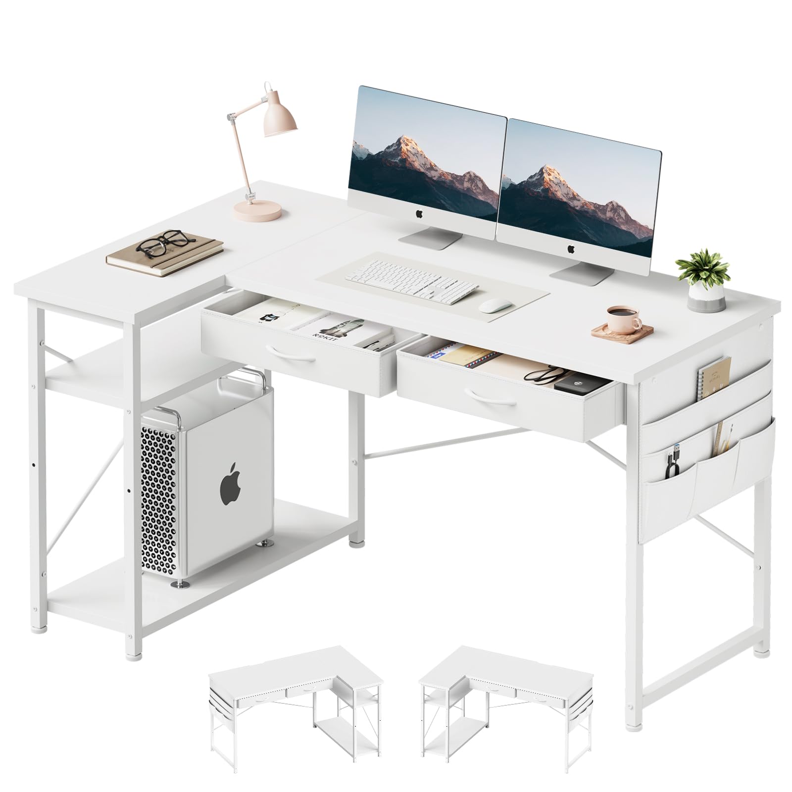 Maihail l字デスク机pcデスク ラック付き パソコンデスク 幅120cm×奥行50cm つくえ 勉強机学習机 左右入替可 布製引き出し付き オフィスデスク ワークデスク 収納ラック 白い