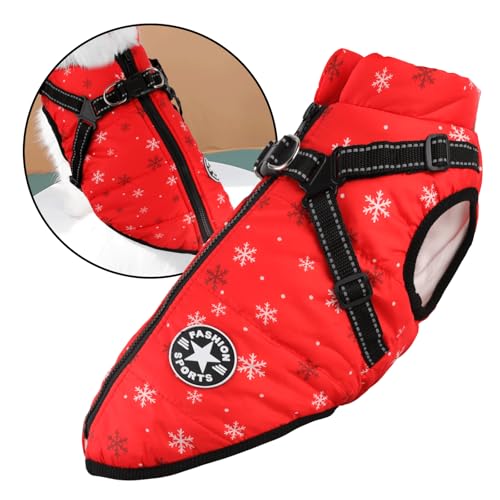 Koramaku 犬服「2024冬の登場」一体型綿コート ハーネス付き 背中開き おしゃれ 牽引 夜間反射 暖かい ペット 猫 犬 服 冬 小型犬 中型犬 着脱簡単 裏起毛 ベスト 防寒 防水 撥水 ジャケットリードリングあり お散歩(L,スノーフレーク)