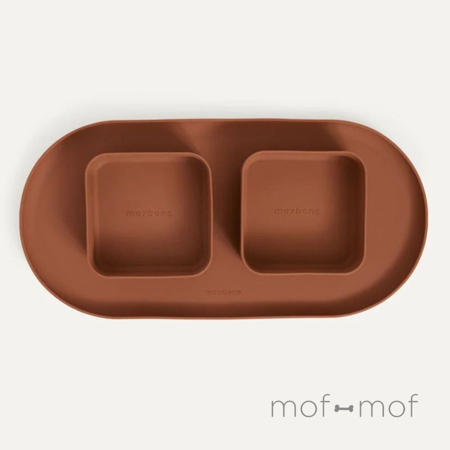 柔らかいシリコン製のボウル2つとマット1枚のセット。これさえあれば家でもお出かけ先でもいつでも清潔に食事できます。max-bone スクエアボウル&マット セット キャメル マックスボーン 餌台 北欧 ハイクオリティフードボウル フードマット シリコン 脱プラスチック おしゃれ かわいい 小型犬 中型犬 犬 ジャケット モフモフ