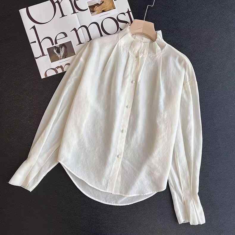 【予約販売5~12営業日での発送】ブラウス レディース フレンチ宮廷風 スタンドカラー メロウフリル プリーツ 切り替え 長袖 ゆったり 無地 ポリエステル 春 ベージュ ロマンチック きれいめ 大人 上品 個性派デザイン(x2)