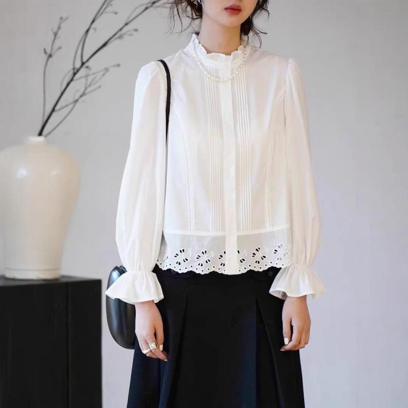 【予約販売5~12営業日での発送】形態安定 ゆったり 通勤 シャツ レディース 春 綿混 ポロ襟 前ボタン ホワイト フレンチロマンチック フリル 透かしレース 切り替え レトロ フレアスリーブ 上品