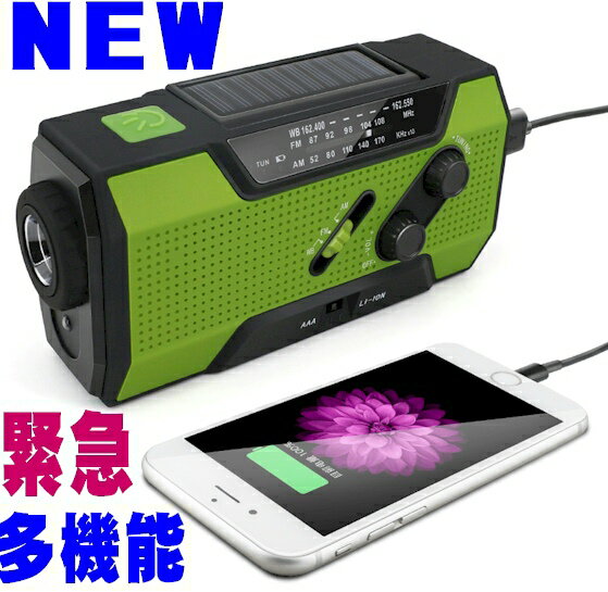 災害支援 1台5役緊急時も安心のスマホ充電付ソーラーダイナモ情報ラジオとライト 手回し発電携モバイルバッテリー充電長寿命高輝度 LEDライトと4LEDデスクライト付き 1台5役ソーラーダイナモラジオライト さらにパワーアップ新製品 いざっと言う時に便利な手回し発電とソーラーで発電器、モバイルバッテリーの充電、AM/FMラジオ 、長寿命LEDライト、デスクライト、赤点滅緊急サイレンが付いたスピーカー付き緊急情報ダイナモラジオライトです。緊急時も安心。さらに市販の18650リチウム電池2本でも動作します。 災害や地震はいつ起こるかわかりません。非難袋などに入れておくことをお勧めします。 声が出ないなど緊急時のサイレンやスマホやビデオカメラ、デジカメのUSB機器に充電できるこれ以上の機能がないほどの装備で新登場です。 防滴ですのでアウトドアや通学通勤でも重宝します。 約1分軽く手回しでバッテリー1分間手回すと、LEDライトで15~20分間、ラジオは5~10分間使えます 満充電状態にはラジオ8-10時間/読書ライト16-20時間使えます。 手回し発電で緊急時安心。多機能でモバイルバッテリー充電に対応します。 製品特徴 機能1 手回し発電、ソーラー、2000mAhモバイルバッテリー、USB入力、市販の18650リチウム電池2本・満充電状態にはラジオ8-10時間/読書ライト16-20時間使えます。 バッテリー1分間手回すと、LEDライトで15~20分間、ラジオは5~10分間使えます。 機能2 ラジオはAM/FMラジオを受信 防滴構造 ・緊急時でも安心のAM/FM対応のラジオです。受信感度もばっちりです。 防滴構造IPX-3 水に沈めないでください。水しぶきや少量の雨から本体を守る防滴仕様で使えます、大雨で使用する場合ご遠慮ください! 機能3 赤LED点滅緊急サイレンとスピーカー付き ・スピーカーを内蔵していますので緊急時はラジオをみんなで聞くことも可能です。 声が出せない時や緊急時のLED点滅サイレン発声機能付で安心です。 機能4 高寿命高輝度LEDライトとデスクライト付きとキャラビナ付き非常時安心。 ・超寿命5万時間高輝度1WLEDライトと4灯デスクライト付きなので暗闇でも安心です。 離れた場所での緊急確認にも安心です。 ・デスクライトは傾けられスタンドや乱反射で簡易ランタンにも使用できます。 機能4 モバイルバッテリーUSB充電付きで非常時安心。 USBi端子を付属していますので緊急時、どこでも充電でき安心です。緊急時は、緊急伝言電話や緊急伝言メールが利用できるようになり安心です。 製品仕様 本体寸法 約157×57×73mm(幅×奥行き×高さ)重さ380g カ ラ ー グリーン 電 源 2.7から4.2V 最大3W ISB端子、手回し発電、2000mAhリチウム充電池、ソーラー、市販市販の18650リチウム電池2本 ライト/デスクライト 超寿命型5万時間1W高輝度LEDライト 4灯LEDデスクライト スピーカー、アンテナ 受信機 AM /FM 520~1710KHz 76~106MHz 充電池 最新高効率リチウムポリマー3.7V/18650ma/h 2000mA/h 動作時間 満充電状態にはラジオ8-10時間/読書ライト16-20時間使えます。 バッテリー1分間手回すと、LEDライトで15~20分間、ラジオは5~10分間使えます。 材質 ABS樹脂 付属 マイクロUSBケーブル、日本語取扱説明書 USB出力最大5V1A フル充電 平均スマホ2回分※iPhone・携帯電話の充電の際は各機種専用のUSB充電ケーブルを別途ご用意ください。 店長のお勧め 災害はいつ起こるかはだれもわかりません。 いざっと言う時に強い見方になるのが正しい情報と通信の確保 、暗い場合は明かりではないでしょうか。水や食料はその後です。 阪神や新潟地震のときのアンケートもあったらよかった、あってよかった 防災用具が水、缶詰、ラジオとライトとスマホ、タブレット、モバイルバッテリーが完全上位を占めました。 情報AM/FMラジオはゆっくり回しても長時間動作しますので便利です。 ライトは長寿命5万時間5灯LEDライト使用で暗いときにも安心です。 緊急時の連絡用としての携帯電話充電できますので 大変便利です。小型軽量で災害袋、通勤やアウトドアや車の装備品と してもなにかと便利です。 声が出せない時や遠方の緊急サインに便利なサイレンでいざっと 言うときにも役にたちます。 多機能ですが緊急時のために低価格にて販売させていただきます。 国内自治体や公的機関から大量注文が多く人気です。 お勧めです。