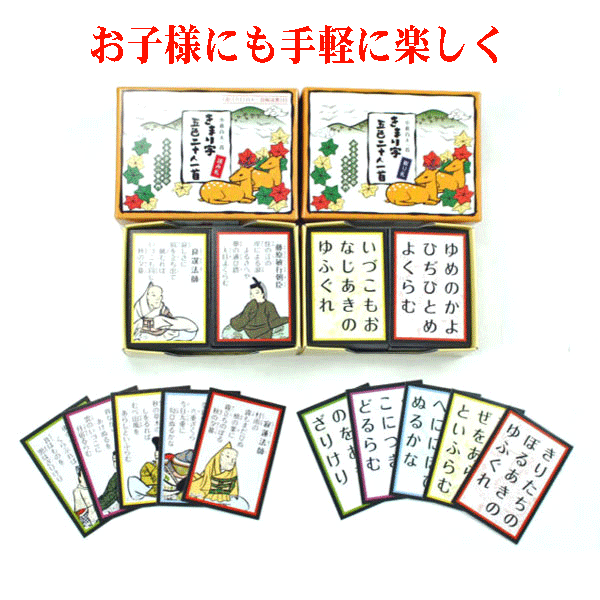 小倉百人一首 きまり字五色二十人一首 読札・取札 大石天狗堂 寛政12年(1800年)創業のかるたの老舗、小倉百人一首に代表される京都大石天狗堂 セットでお得! 初めて百人一首を見たお子さんでも、手軽に楽しくかるた競技が楽しめるかるたです。 学校の休み時間(10分)や、ご家庭でのちょっとした短い時間で、競技かるたが楽しめるように、100枚のかるた札を、きまり字別に20枚ずつ5種類に色分けしました。 取札の裏には上の句が書かれていて、きまり字もわかるようになっていますので練習にも使えます。 きまり字を理解し、変化する楽しさが解るようなかるた札です。 100首覚えたら、競技かるたの世界へ自然に入れるようなかるた札です。読み札・取札のセットです。 【セット内容】 読札・取札 各100枚、小倉百人一首解説書×1、遊び方×1 本体サイズ 85×115×H37(mm)×2箱 プレゼントラッピングも承ります。 ※北海道は別途送料440円、沖縄・離島へのお届けには別途送料1200円となります。 北海道・沖縄・離島へのお届けは配達日時指定を承っていません。北海道・沖縄・離島へのお届けは送料別途