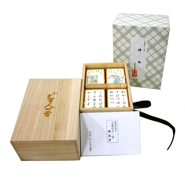 楽天出店23周年記念 楽天出店23周年記念 かるた 小型百人一首 小町 寛政12年創業のかるたの老舗・大石天狗堂 寛政12年(1800年)創業のかるたの老舗、小倉百人一首に代表される京都大石天狗堂 普通の百人一首の半分の大きさのかわいい百人一首です。 小さな百人一首ですが読札100枚、取札100枚揃っていますので学校のテーブルや狭い場所でも競技ができます。 また雛人形のお供に、贈り物にもご利用ください。 【セット内容】 読札・取札 各100枚、小倉百人一首解説書×1 本体サイズの114×88×H49(mm) 札 断裁仕上げ/52×38(mm) ※北海道は別途送料440円、沖縄・離島へのお届けには別途送料1200円となります。 北海道・沖縄・離島へのお届けは配達日時指定を承っていません。北海道・沖縄・離島へのお届けは送料別途