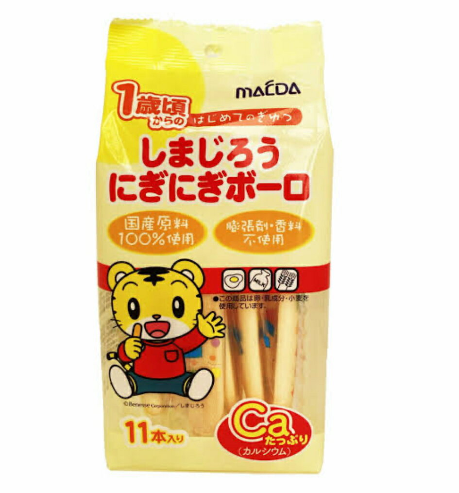 国産原料を100%使用し、にぎって食べられるスティックの 形に焼き上げたボーロしまじろうにぎにぎボーロ11本入×4袋セット