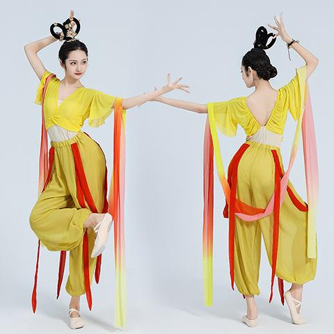 【予約販売5~12営業日での発送】ダンス衣装 セットアップ 大人 レディース チャイナ風 シフォン トップス 半袖 Vネック 背中開き パンツ ウエストゴム ヘッドアクセサリー 通気 ソフト 敦煌 練習着 パフォーマンス ステージ クラシック エレガント