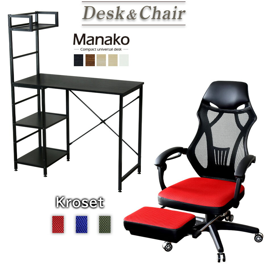 パソコンデスク オフィスチェア セット チェア 在宅 デスクパソコンデスク オフィスチェア セット デスク チェア 在宅 テレワーク ラック 収納 メッシュ リクライニング 肘付き ハイバック 低反発 マナコ クロセット3色 引越し祝い