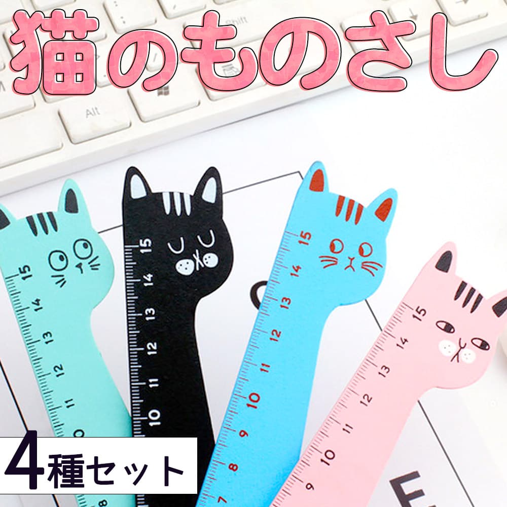 猫 ネコ測り メジャー ルーラー 15cm最短当日出荷◆ 定規 ものさし 猫 ねこ フェイス 木製 15cm (ピンク ミント ホワイト ブラック 4個セット)