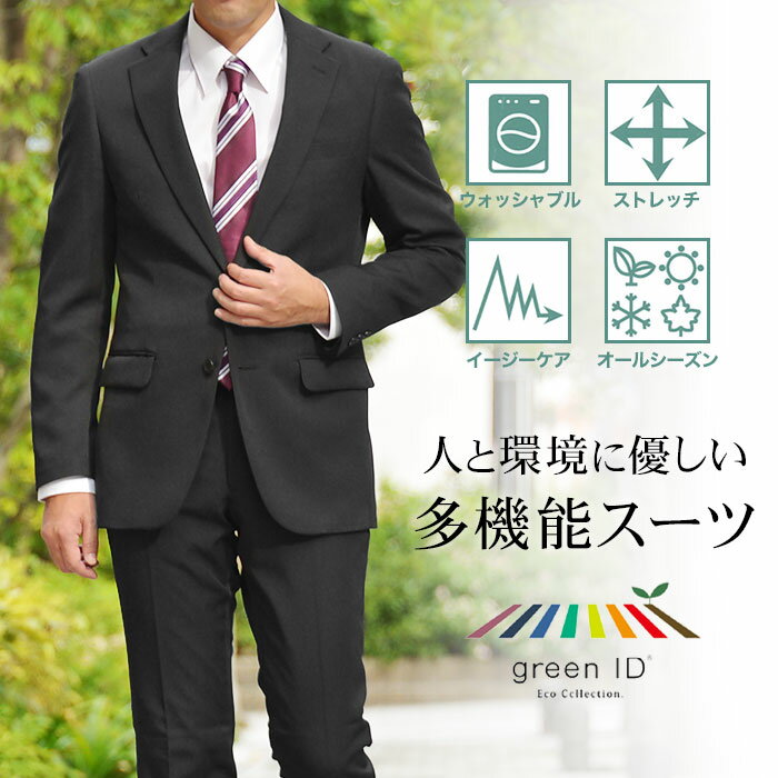 メンズスーツ 通年 エコスーツ 家庭洗濯可能 上下洗える 防シワ suit 紳士服(やや細身/標準体型)スーツ 春夏 洗える 4WAYストレッチ メンズ オールシーズン 2つボタン リサイクルポリエステル ビジネススーツ 洗えるスーツ ウォッシャブル シングルスーツ 通年 秋冬 標準 ややスリム suit 家庭洗濯可能 ブラック Y体 YA体 A体 AB体 リクルート 就活