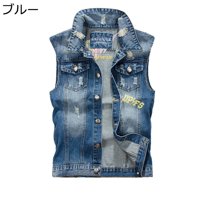 デニムベスト メンズ ダメージ 重ね着 英字柄刺繍 レジ チョッキ Gジャン ジージャン 通気性 カジュアルベスト 春夏秋用 ノースリーブジャケット ライダース 耐磨耗性 ストリート 大きいサイズ