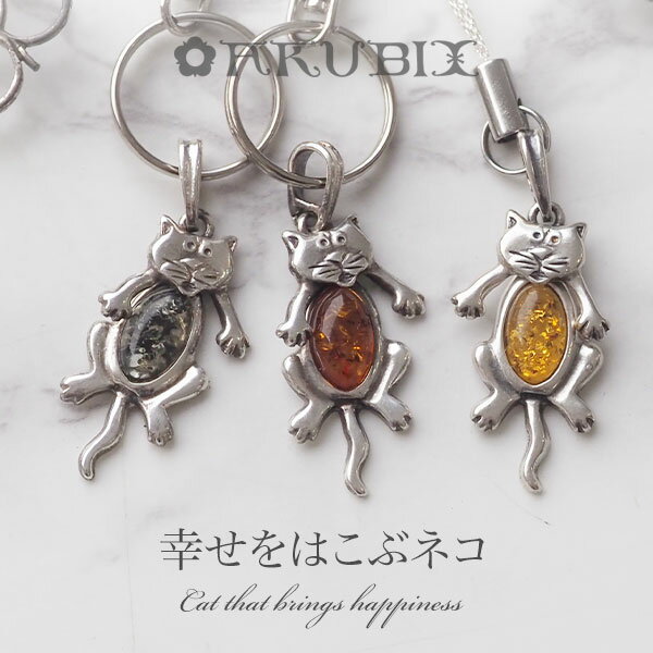 【akubix】プレゼントに。癒しと護身の宝石。かわいい猫ストラップ!【バルト海の琥珀】シルバー猫ストラップ・キーホルダー(ミニポーチ付)【送料無料】(3ツ星)(グリーンのみSランク)【et0147】ラッピング ギフト こはく キーリング チャーム 贈り物 誕生日 天然石 パワーストーン Silver925 ネコ