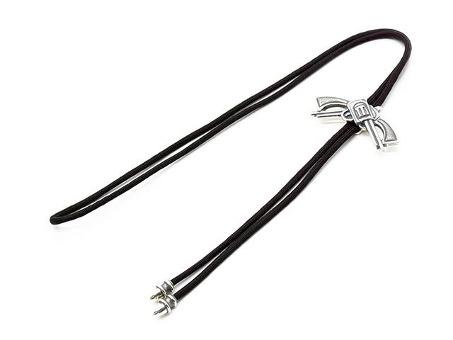 ギフト対応【Cross Pistol Loop Tie】 商品詳細 【Jango/ジャンゴ】の「Cross Pistol Loop Tie/クロスピストルループタイ」になります。 BILLY THE CAPSからの依頼で昔からあるデザインをJangoバージョンで製作したループタイです。 ストッパー、剣先もオリジナルで製作し、裏のストッパーはお好みの位置で簡単に調整できます。 ロープはレザーではなく柔らかくしなやかなポリエステル素材の高強度パラコードを使用。 紫外線による色焼けにも強く グリース等の整髪料や汗も簡単に洗え、シャツでもTシャツでも使えるアイテムです。 【品番:JNT-20】 【カラー:シルバー×ブラック】 【素材:Silver925×Nylon】 【サイズ:縦2.2cm×横6.2cm×ロープ100cm】