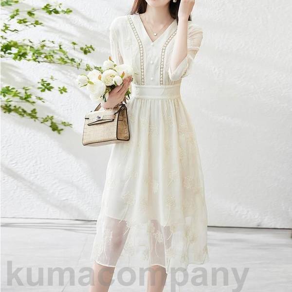 ワンピース ドレス 袖あり 刺繍 エレガント レディース きれいめワンピース ドレス 袖あり 刺繍 エレガント レディース きれいめ カジュアル おしゃれ 七分袖 大人 可愛い フェミニン ミモレ丈 ナチュラル Vネック ゆったり 体型カバー 透け感 ハイウエスト ベージュ 春 秋 夏 20代 30代