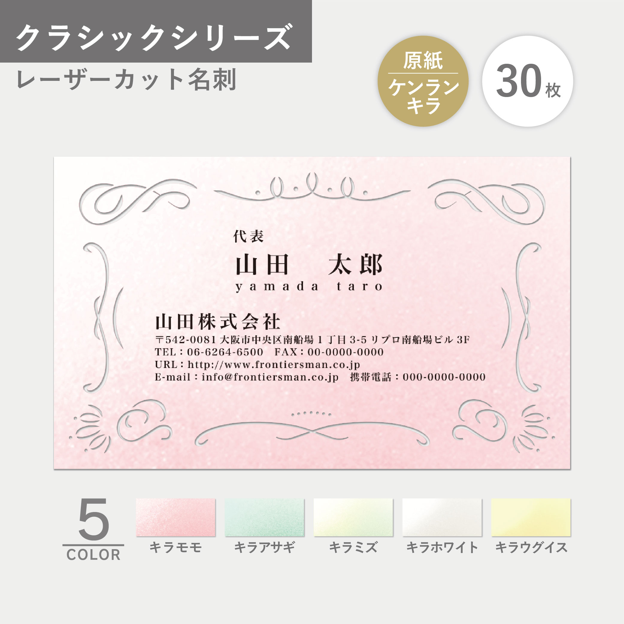 商品情報材質【紙】ケンラン キラ【厚さ】0.29mm/225kgサイズ横90mm×縦55mm色文字-黒1色(表面印刷のみ)紙-キラモモ、キラアサギ、キラミズ、キラホワイト、キラウグイス商品説明レーザー加工を施したオリジナル名刺注意事項・本品は細かいレーザー加工を施しております。そのため非常に繊細であり、名刺が破れてしまう場合がございます。お取り扱いには十分にご注意ください。・ご使用になる名刺入れによっては、出し入れの際にひっかかってしまい、破れてしまう可能性ございます。・紙の種類によってレーザー加工の焦げが残ってしまう場合がございます。・レーザー加工の抜き残しがある場合がございます。その際は指で軽く押していただく、又は細いもので押していただければ抜くこと可能です。・印刷時や出来上がった用紙の断裁時には若干のズレが発生いたします。精度の高い印刷機を使用していますが、最大で1ミリ程度の印刷ズレが起こる場合があります。現在のページでご購入いただけるのは下記の商品ですデザイン:クラシック 枚数:30枚 紙:ケンラン キラ 年代・性別問わず受け入れられるクラシック調気品漂う王道スタイル 10