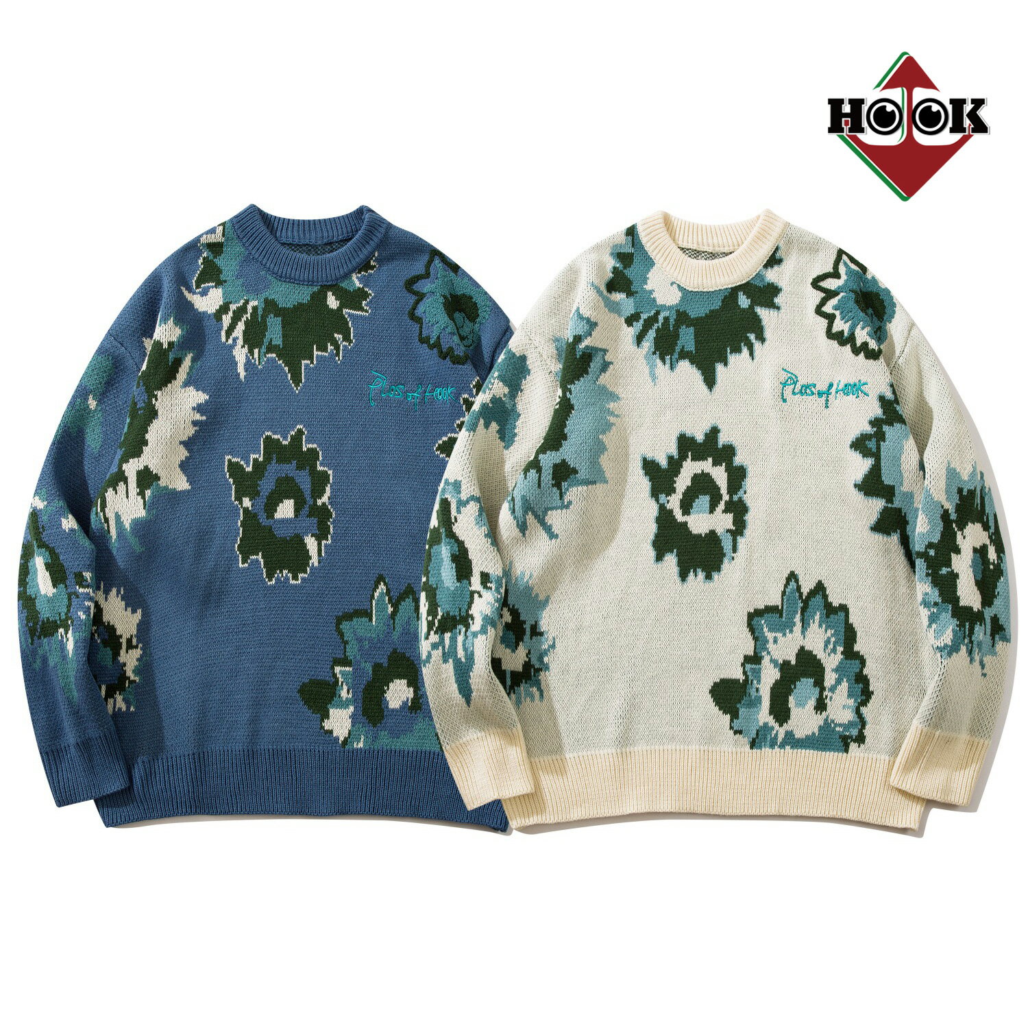 《【HOOK】絵画調ひまわりジャカード編みニット 》ニット メンズ レディース セーター カップル ペアルック お揃い ジャガード 冬 秋 ビッグシルエット オーバーサイズ ユニセックス 韓国ライク 古着風 レトロ 個性派 ストリート ひまわり柄【HOOK】