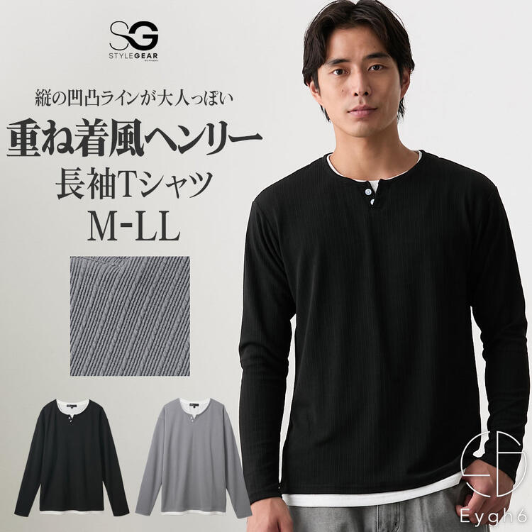 重ね着風 ヘンリーネック 長袖 Tシャツ カジュアル きれいめ カジュアル グレー ブラック M L LLTシャツ 長袖 フェイクレイヤード ヘンリーネック 長袖Tシャツ M-LL メンズ ニッセン nissen