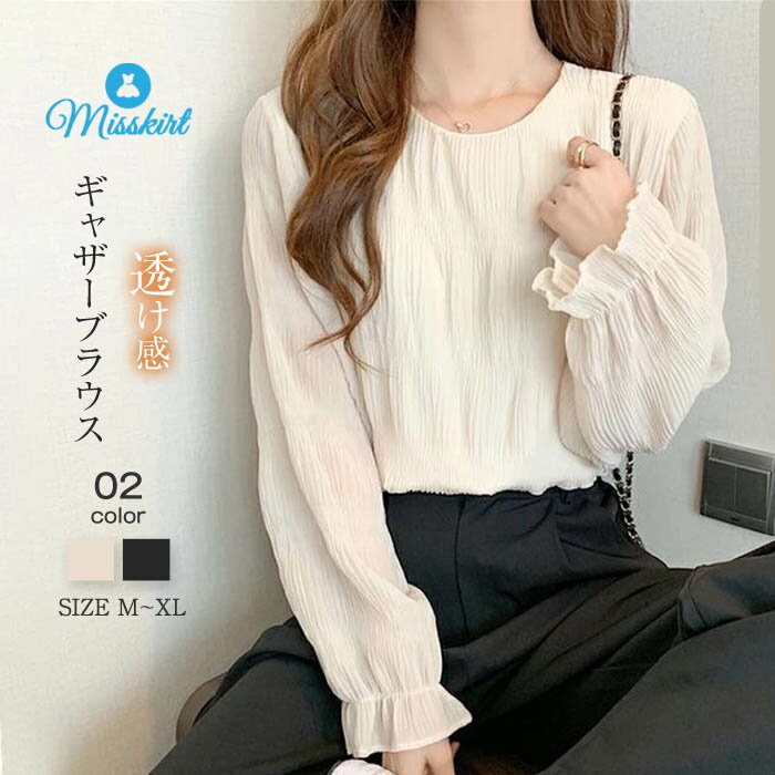 ★メール便送料無料★ギャザーブラウス ラウンドネック とろみシャツ レディース シアートップス シアー レース ギャザ フォーマル オフィス ビジネス デート 女子会 かわいい シンプルブラウス レディース シャツ 春 夏 秋 シフォン トップス プルオーバー 長袖 シャツブラウス とろみシャツ シャーリング ギャザー フレア袖 透け感 裏地付き レイヤード フォーマル オフィス 通勤 OL きれいめ 上品 無地 おしゃれ 大人 20代 30代 40代 50代