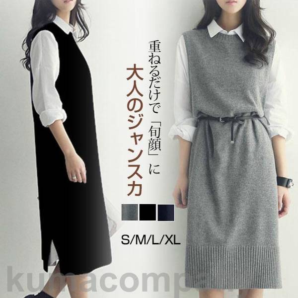 ワンピース ベスト レディースワンピース ジャンスカ ジャンパースカート ミドル丈 ノースリブ vネック カジュアル フォーマル オフェス 通学 ゆったり カジュアル