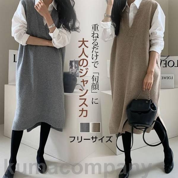 今季のトレンドアイテムとして大注目。きれいなフォルムで女性ら【送料無料】ノースリーブワンピース ニット ニットロングベスト Vネック 厚め 暖かめ 秋冬 ジャンパースカート ロング丈 無地 ベスト リブニット ロング 大人