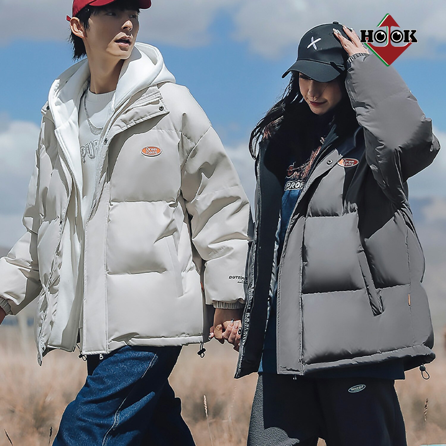 《【HOOK】ストリート風レイヤード風中綿・ダウンジャケット 》アウター 中綿 ジャケット 冬 メンズ レディース カップル ペアルック 防寒 中綿 ビッグシルエット オーバーサイズ ユニセックス 韓国 ライク オルチャン 英字 ストリート 個性派 レイヤード風 フード付き【HOOK】