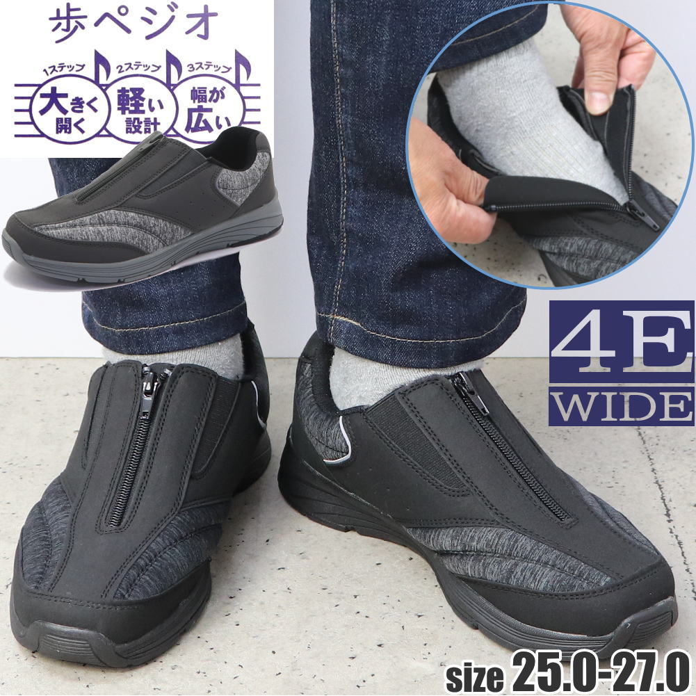 メンズ 大きく開く 幅広 4E 軽量 おしゃれ 介護タイプ スリッポン カジュアルシューズ ファスナ No.1823
