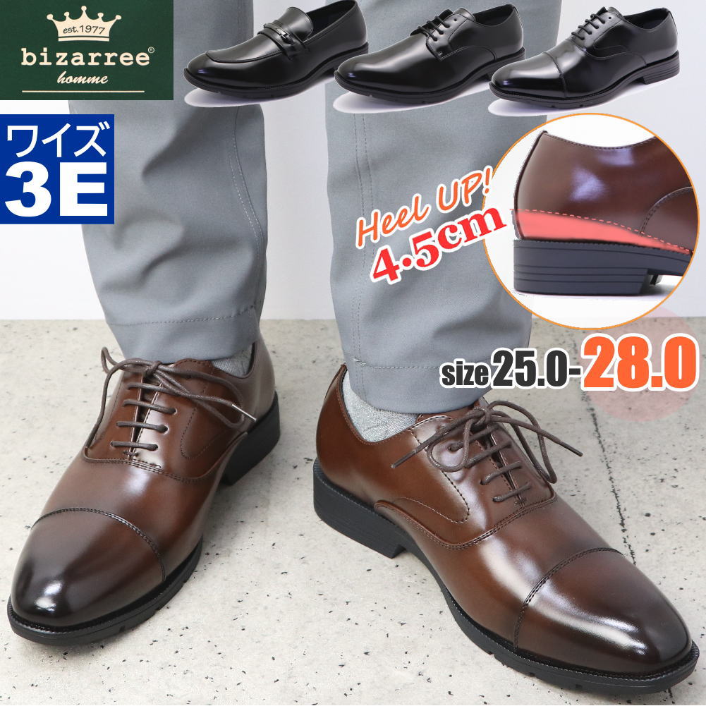 即納 メンズ ビジネスシューズ 4.5cm ヒールアップ インヒール シークレット bizarree ビザリー 幅広 3E 防水 屈曲 ストレートチップ プレーン ローファー No.50090-2