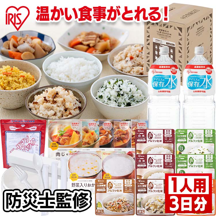 税込3,980円以上ご注文で送料無料(一部除く)♪非常食セット1人用 水入り 21点 HSS1-21送料無料 1人用 21点 3日分 非常食 保存食 アルファ米 レトルト レーション 加熱セット付き 防災グッズ 防災 災害 震災 台風 避難 緊急 非常用 自宅 待機 自宅避難 備え アイリスオーヤマ iris06