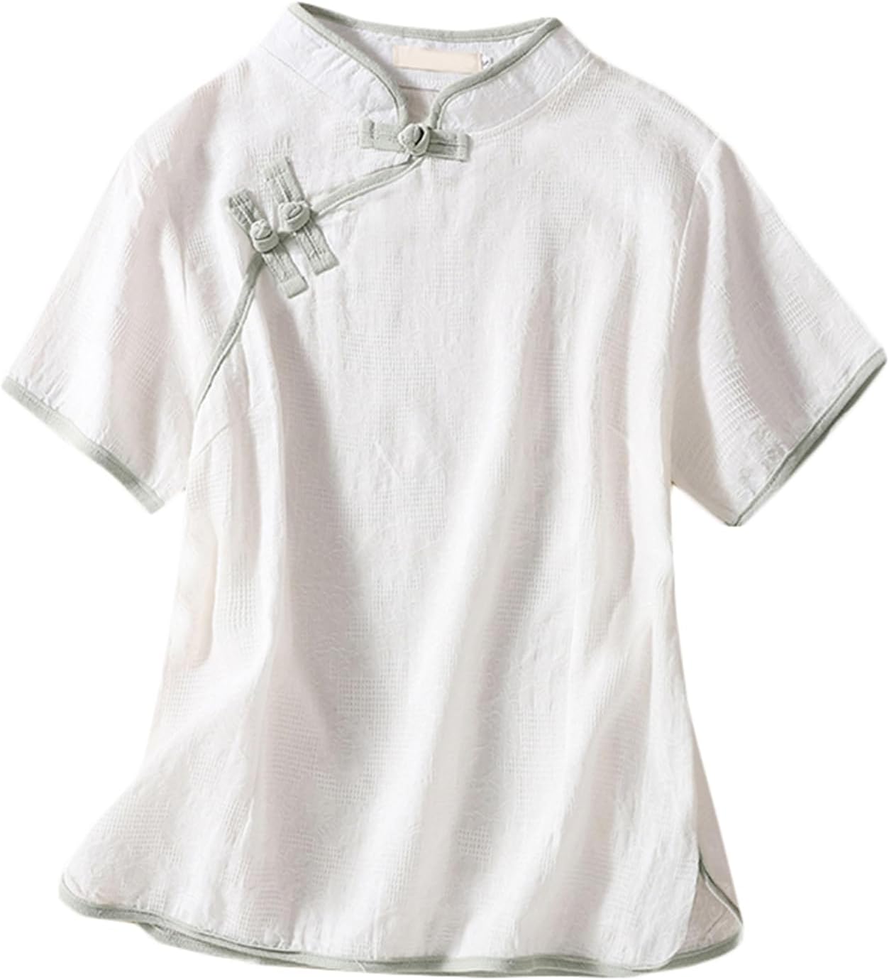 チャイナ服 リネンシャツ 漢服 レディース 半袖 薄手 ブラウス ゆったり 大きいサイズ チャイナボタン 立ち襟 無地 トップス エスニック 茶道服 麻 綿 夏 民族風