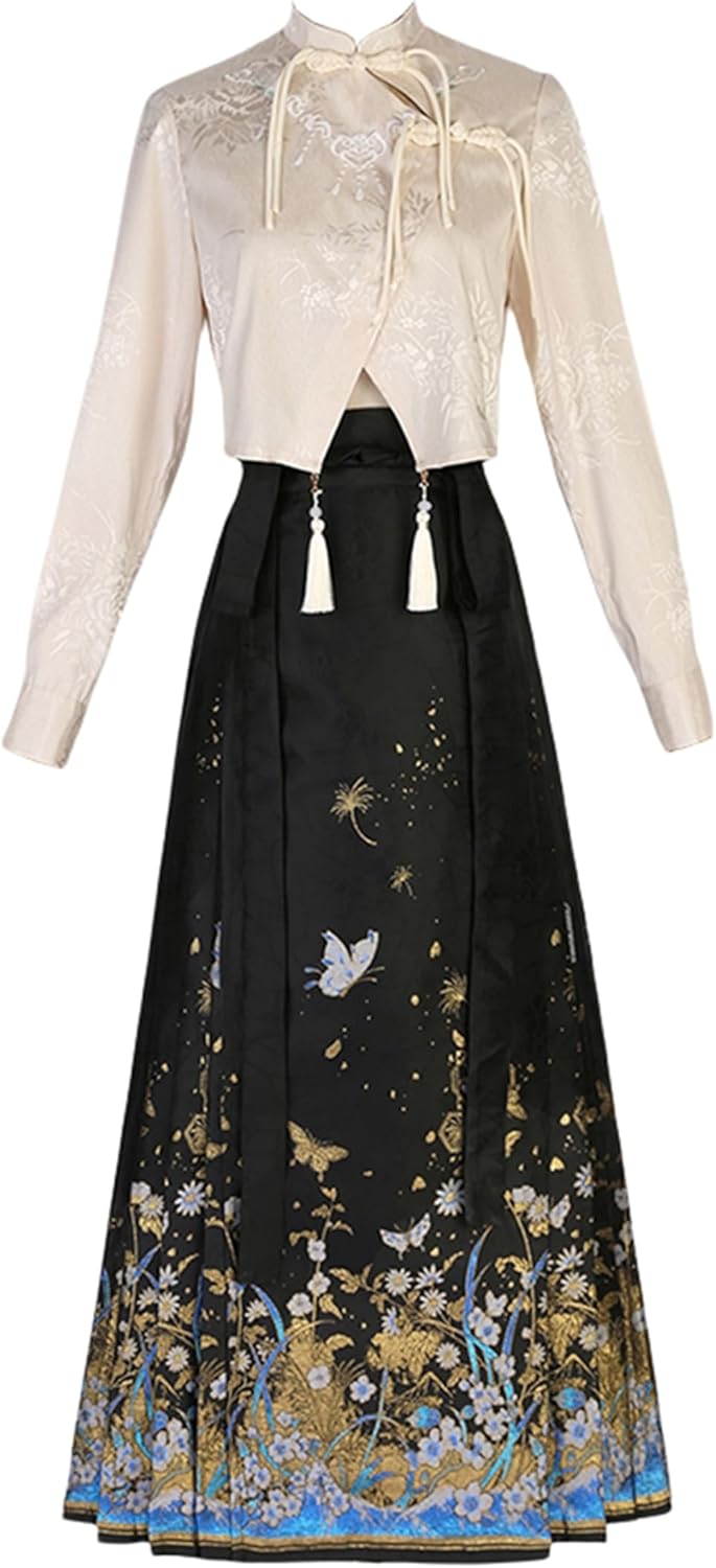 チャイナボタン マミアンスカート 短い上着 上下セット ブラウス 2点セット 刺繍 蝶 花 春秋 ヴィンテージ 長袖 タッセル 中華風