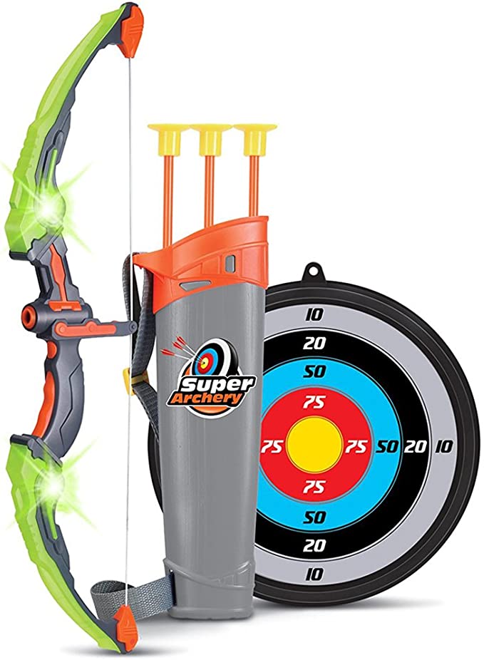 1【セールスポイント】弓矢セット玩具はインドアもアウトドアで遊べます.アーチェリー 弓矢玩具は遊びながら手と目の協調性を鍛えて、また根気を育成できます. 2【特点】結構な勢いで飛び出すが、当たっても痛くない。耐衝撃性、曲げ疲労性など機械的特性のバランスに優れるエービーエス素 材で作られております。ストリングは高分子ポリエチレン系の繊維を使用しており、耐久性、安定性、スピードに優れています。 3【LEDモード】一回に押すとライトは常時点灯です。二回に押すとライトはスローフラッシュになります.三回に押すとライトはクイックフラッシュになります。綺麗なLEDライトがあって、夜も遊べます 4【ご注意】矢は滑らかな物の表面に吸着したら、すぐ矢を引っ張らないでください.正しい取り方は矢の吸盤を少し開けてからすぐ取れます. 5【プレゼント】綺麗なパッキングが付いて、子供へのプレゼントや進学などをお薦めします.子供は休みの日に運動をして、仲間の関係をもっと親しみようになります.
