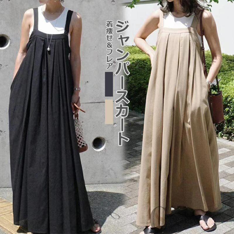 ジャンパースカート ワンピース フレアワンピース プルオーバージャンパースカート レディース ワンピース ロング丈 フレアワンピース マキシ丈 大きいサイズ プルオーバー ジャンスカ 体型カバー スカート サロペット ノースリーブ ロングワンピース サロペットスカート 黒 ゆったり 春夏