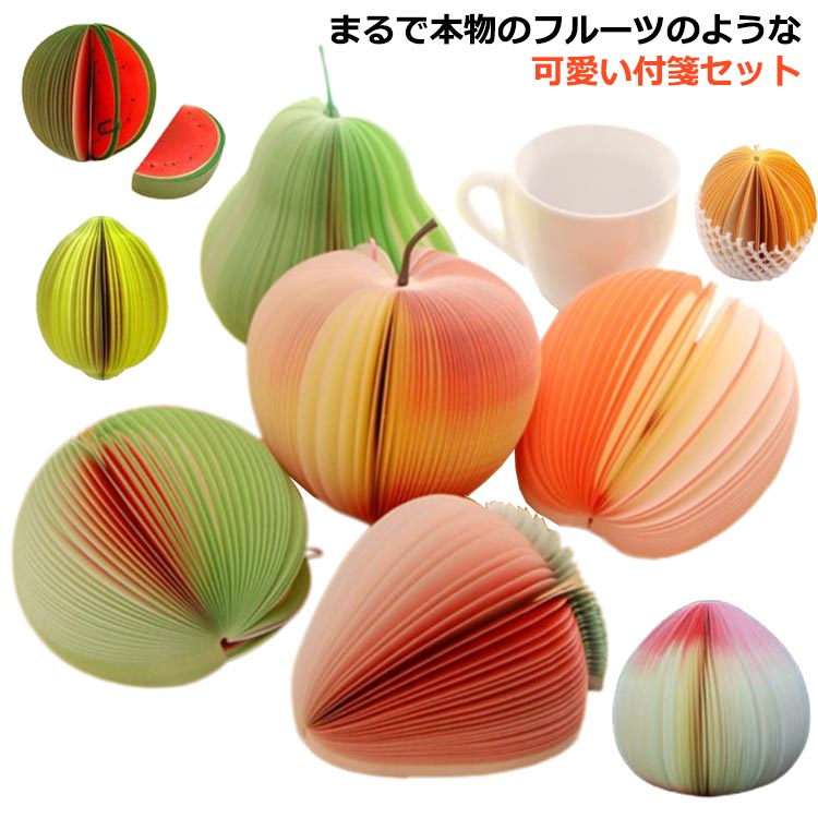 まるで本物のフルーツのような可愛い付箋セット。ネットに入れればカワイイ卓上インテリアに。デスクやテーブルに置いておけば思わず楽しい気分になれます♪かわいい見た目だけれど、使い勝手も抜群。フルーツを一切れとるように、楽しく付箋が使えます。誕生日、卒業、退職、大事なイベントにサプライズとして。おもしろ文房具として大人気です。超お得な9種類セット、ご自分用はもちろん、お友達へのプチプレゼントとしても大変喜ばれるでしょう。 サイズ9種類セットサイズについての説明高さ:約9.5cm幅:約4.5cm(開いた時直径約9cm)厚さ(畳んだ状態で):約1.3cm素材色写真色備考サイズ詳細等の測り方はスタッフ間で統一、徹底はしておりますが、実寸は商品によって若干の誤差(1cm~3cm )がある場合がございますので、予めご了承ください。製造ロットにより、細部形状の違いや、同色でも色味に多少の誤差が生じます。パッケージは改良のため予告なく仕様を変更する場合があります。▼商品の色は、撮影時の光や、お客様のモニターの色具合などにより、実際の商品と異なる場合がございます。あらかじめ、ご了承ください。▼生地の特性上、やや匂いが強く感じられるものもございます。数日のご使用や陰干しなどで気になる匂いはほとんど感じられなくなります。▼同じ商品でも生産時期により形やサイズ、カラーに多少の誤差が生じる場合もございます。▼他店舗でも在庫を共有して販売をしている為、受注後欠品となる場合もございます。予め、ご了承お願い申し上げます。▼出荷前に全て検品を行っておりますが、万が一商品に不具合があった場合は、お問い合わせフォームまたはメールよりご連絡頂けます様お願い申し上げます。速やかに対応致しますのでご安心ください。メモ帳 付箋 フルーツメモ 9種類セッ 文房具 事務用品 紙製品 封筒 付箋紙 豊富な品揃え