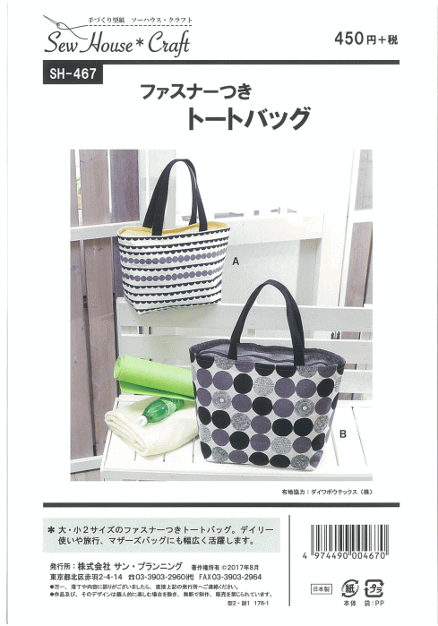 使いやすい大・小2サイズのファスナーつきトートバッグ。型紙 パターン ファスナーつきトートバッグ No.SH-467 ソーハウスクラフト サンプランニング 大人 子供 ベビー 赤ちゃん 作り方 洋裁