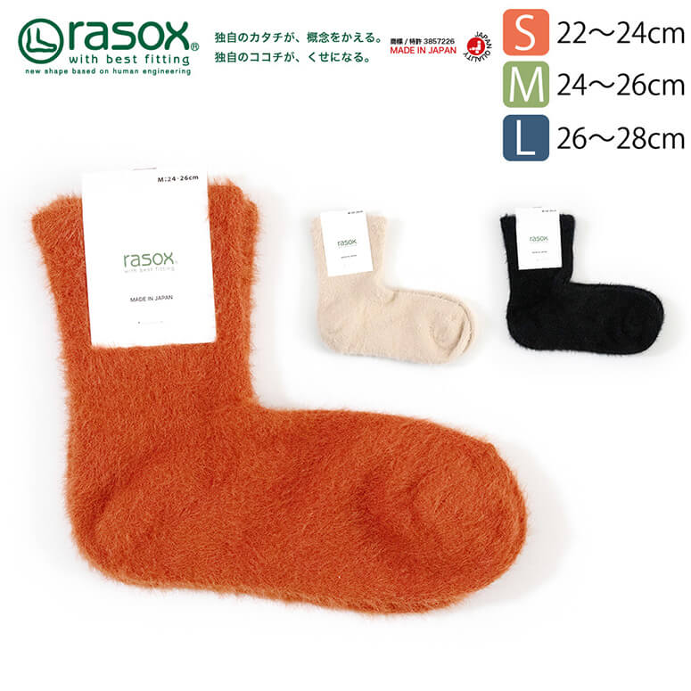 メーカー希望小売価格はメーカー商品タグに基づいて掲載しています。 ギフト対応Information【ラソックス】足の負担が少ないL字型の形をしたソックスを開発し、とことんまで足元の快適さを追求しているメーカーです。商品は全て日本製にこだわり、丁寧な作りをしている人気のブランドです。足の形と何故ソックスは同じ形ではないのか???日常生活の中で一番多い足の形はL型です。立っているとき、座っているとき・・・全てL型なのです。インディーズスポーツブランドとしてスタートしたラソックス。L型のラソックスの靴下は、足を包み込むような履き心地を実現しました。これは、疲れにくく、靴下がずれにくい一番の形なのです。一度は履いたらやめられないラソックスのL型ソックスを是非お試しください。L型ソックスは、ラソックスだけです。(特許取得)男性にも女性にもお使いいただけます。【ファーモール・ミッド ソックス 日本製】まるでミンクのように柔らかな肌触りのファーモール(化繊糸)で編み上げたソックス。病みつきになるほどにソフトで優しい履き心地。お家でのくつろぎ時間にもオススメです。//テーパー構造//足の形に合わせて足首から履き口まで広がっている事が特徴。締め付けにくくずれにくい構造。プレゼントとしても人気です!サイズS22-24cmM24-26cmL26-28cm生産国ナイロン/ポリエステル/その他 日本製