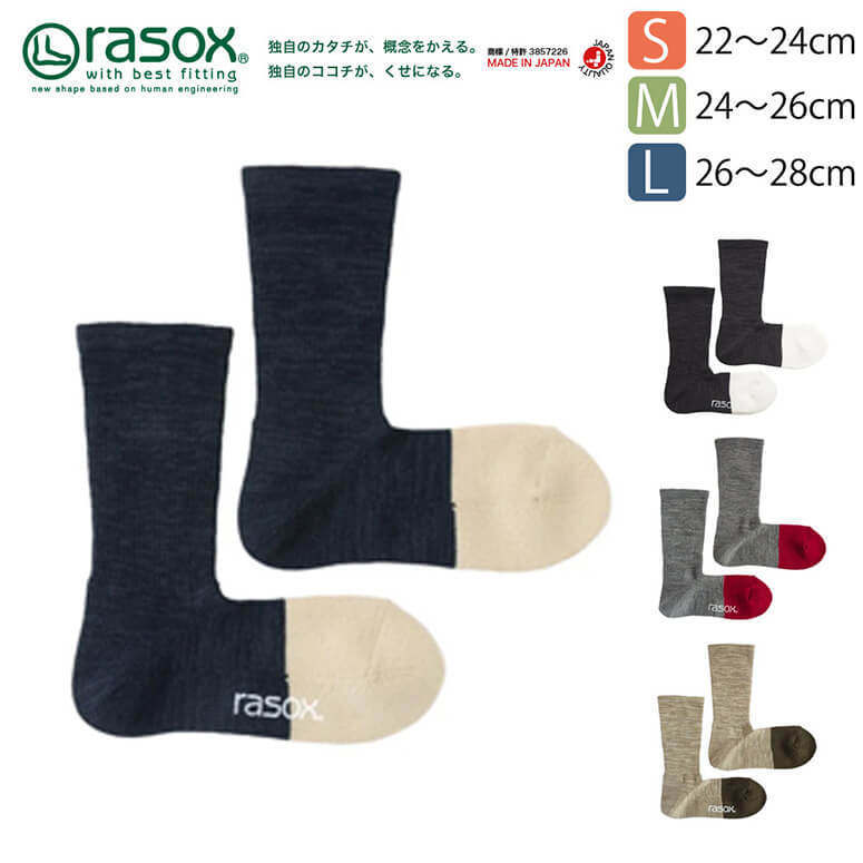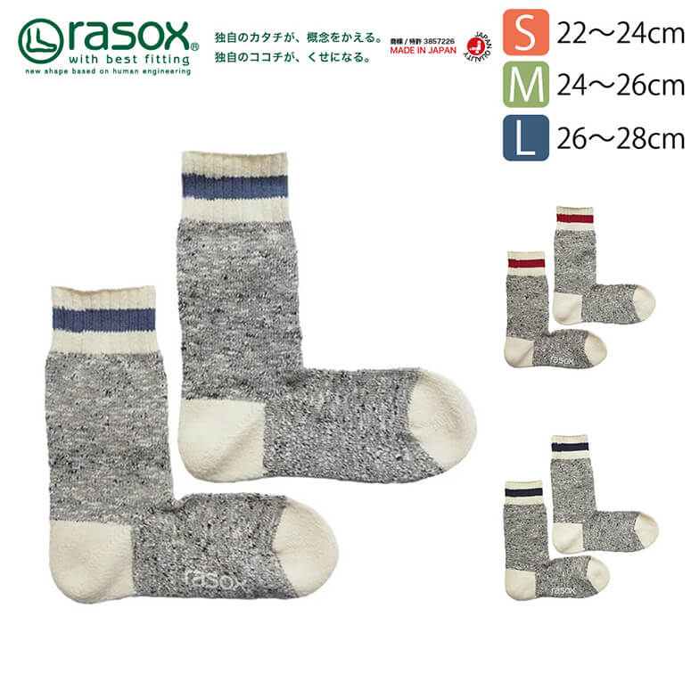 rasox ラソックス 足を包み込むやさしい履き心地♪★期間限定!ポイント15倍対象商品★rasox(ラソックス) 3ライン・リブクルー ソックス L字型 靴下 くつ下 メンズ レディース 日本製 (ca230cr01)